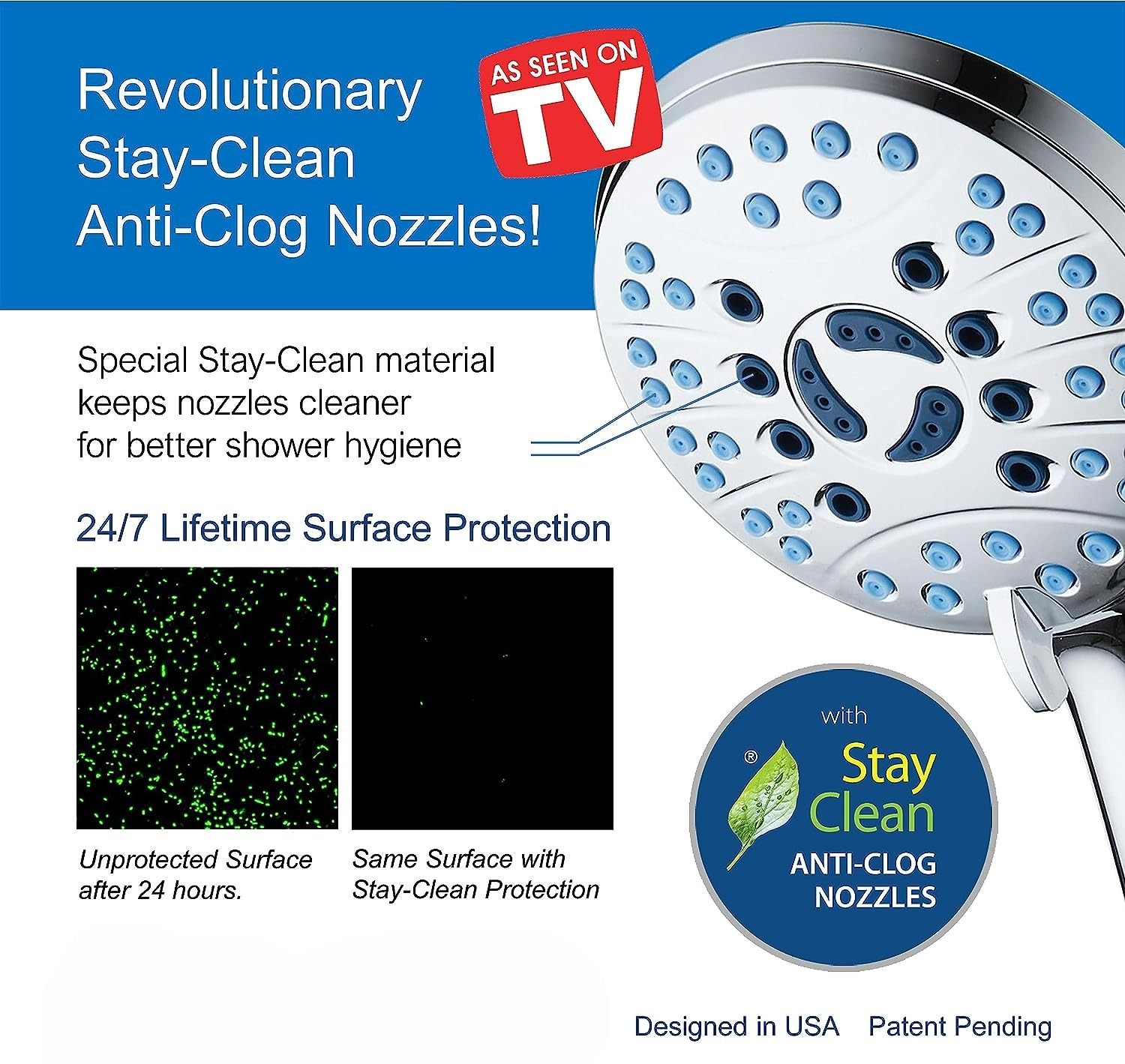 - STAY CLEAN ANTI-CLOG NOZZLES: Special material in nozzles prevents clogs, ensuring cleaner showers and improved hygiene maintenance effortlessly.